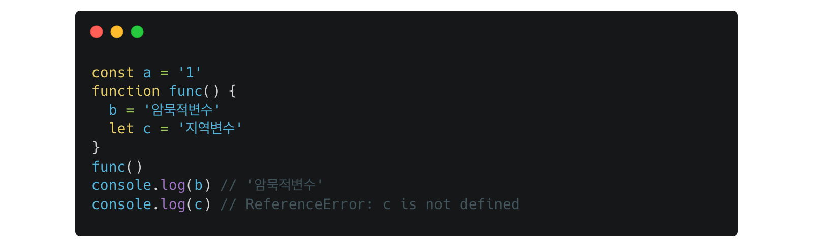 또한 이런 변수들은 전역 객체의 프로퍼티가 되기 때문에 이름처럼 암묵적 전역 변수 라고 한다.