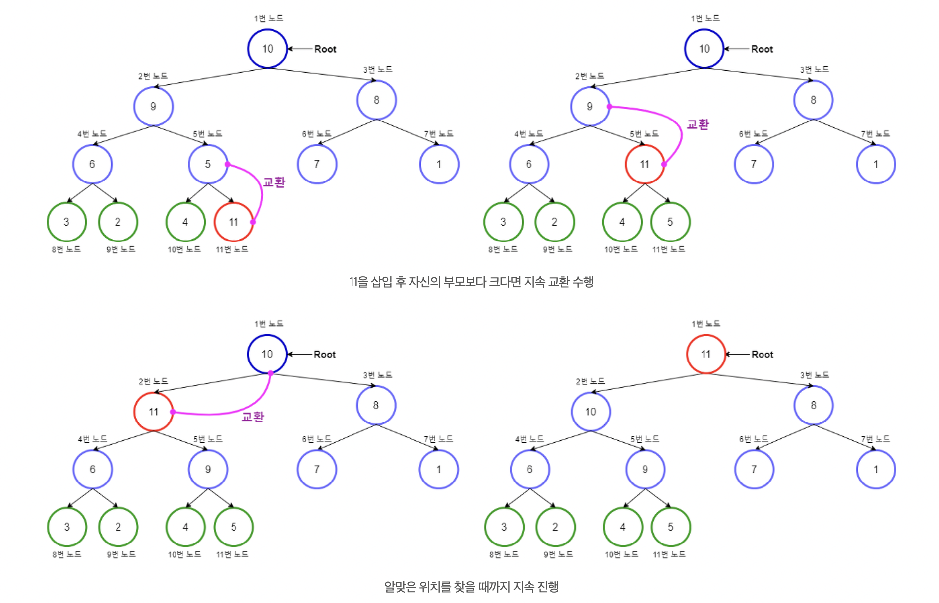 원소를 맨 밑에 넣어서 꼭대기까지 비교하면서 올린다.