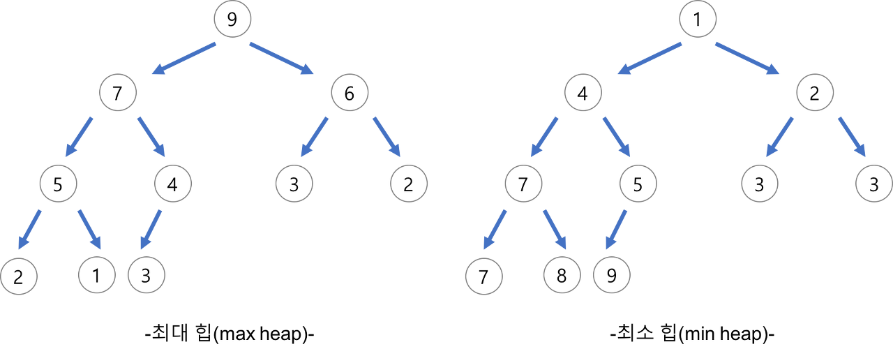- 최댓값이 맨 위인 힙을 최대힙(max-heap), 최솟값이 맨 위인 힙을 최소힙(min-heap)이라고 한다.