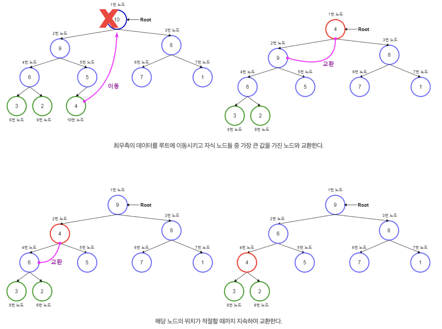 - 왼쪽 자식과 오른쪽 자식은 부모 노드보다 작은 값을 유지하기만 하면 된다.