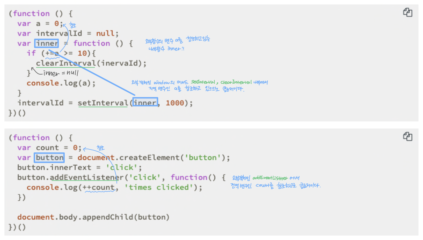 정확히 예를 든다면, 외부함수의 변수를 참조하는 내부함수가 외부함수 자체의 return 값일 경우