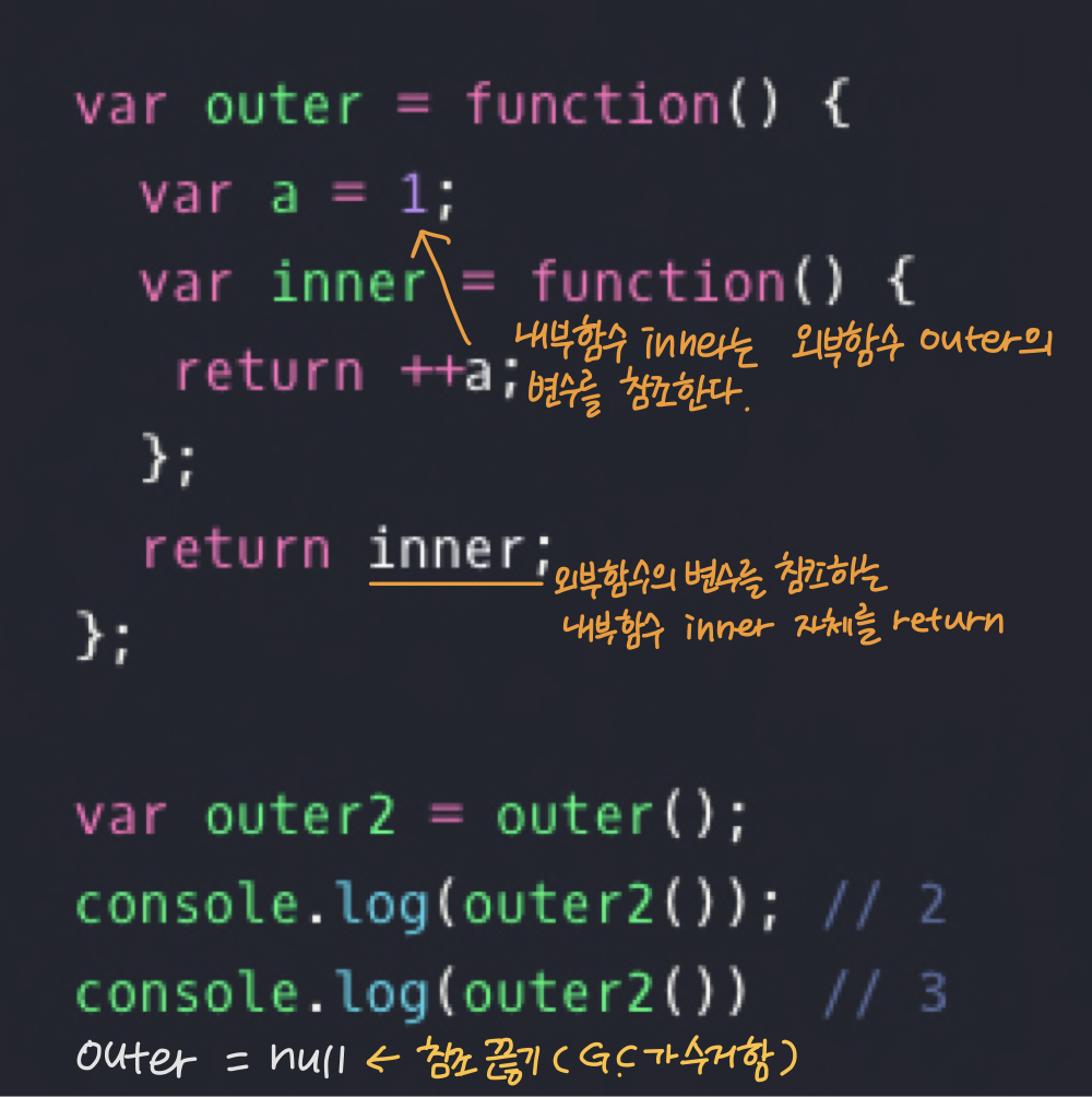 outer와 내부 변수들은 함수가 종료되었으니 가비지 컬렌터의 수집 대상이 되지만,